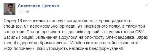 Об этом на своей странице в Facebook написал пресс-секретарь президента Украины Святослав Цеголко. "Среди 16 освобожденных из плена сегодня – ребята из кировоградского спецназа, 81 аэромобильной бригады, 91 инженерного полка, а также три волонтера. Об этом президенту доложил первый заместитель главы СБУ Василий Грицак", - сообщил Цеголко. Он уточнил, что освобождение пленных произошло на блокпосту "Александровка", сейчас они едут в Краматорск.