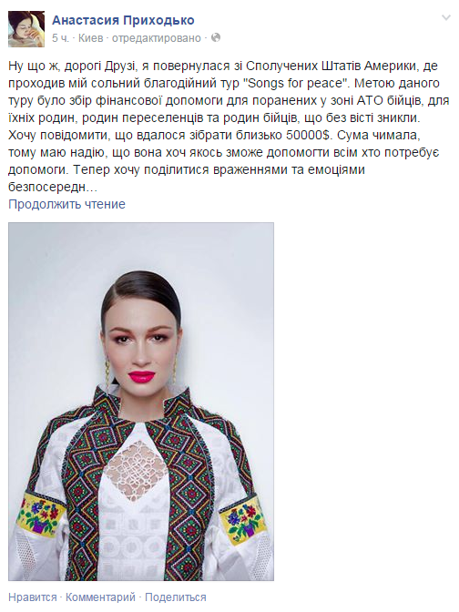 По словам певицы, перед ее выступлением в Филадельфии Семенченко заявил, что Приходько позволила ему собирать средства на АТО во время концерта.