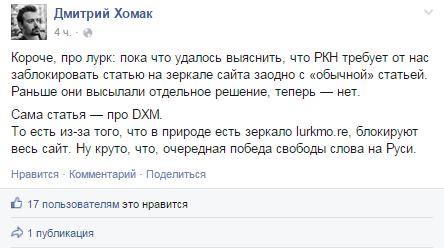 «То есть из-за того, что в природе есть зеркало lurkmo.re, блокируют весь сайт. Ну круто, что, очередная победа свободы слова на Руси», — объяснил Хомак.