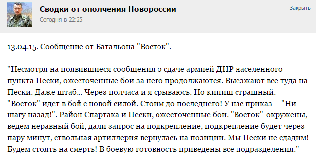"Несмотря на появившиеся сообщения о сдаче армией ДНР населенного пункта Пески, ожесточенные бои за него продолжаются. Выезжают все туда на Пески.