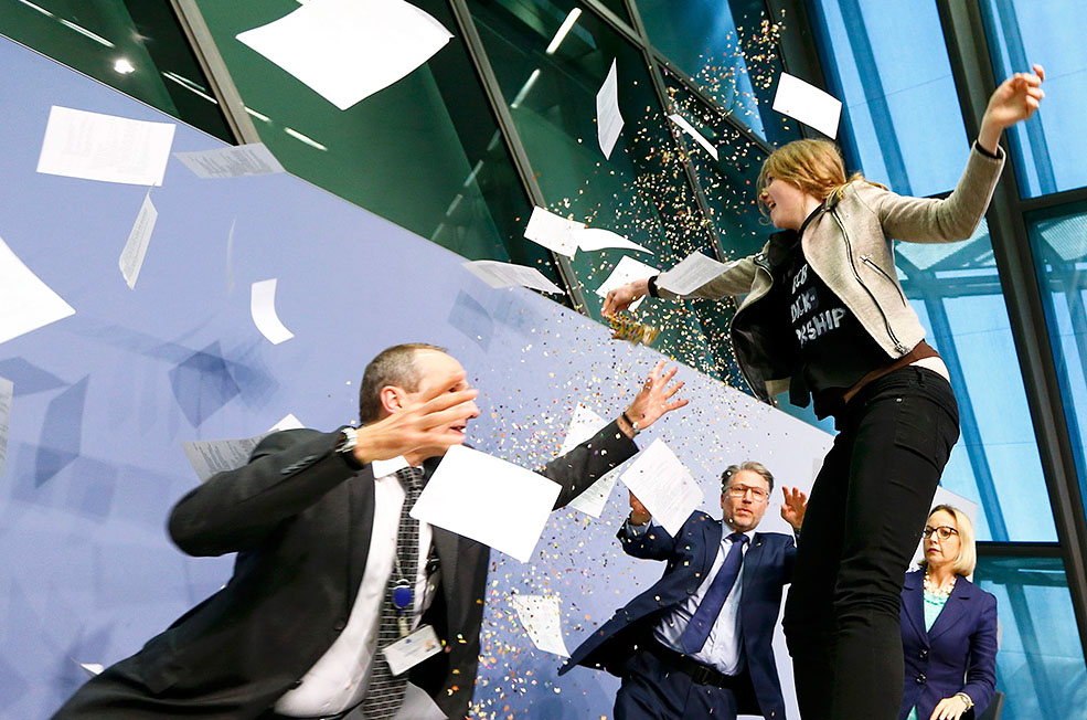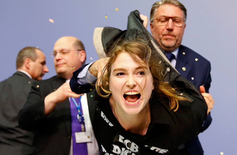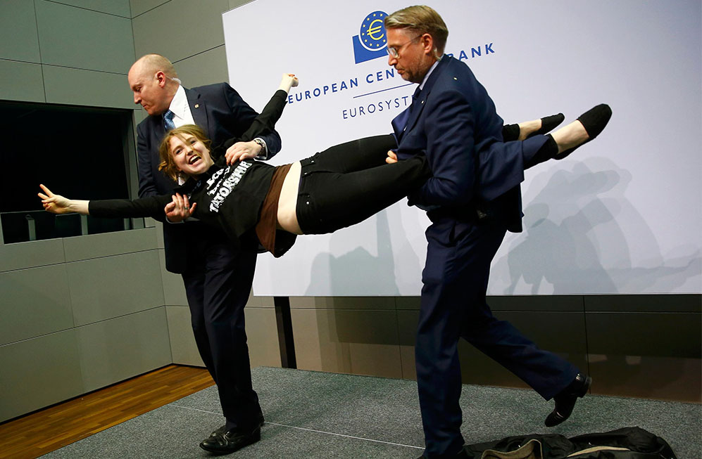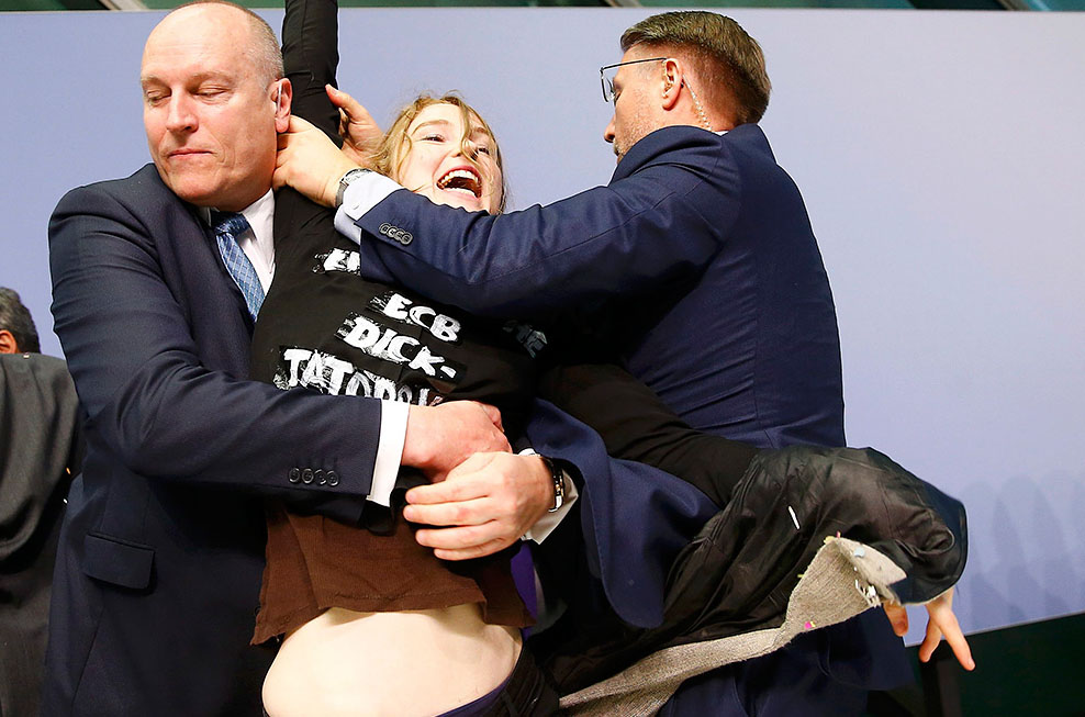Спустя несколько минут после начала пресс-конференции ЕЦБ по итогам заседания в среду девушка в черной футболке прервала ее, взобравшись на стол Марио Драги.
