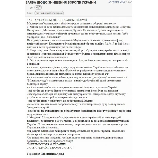 Пресс-служба "Оппозиционного блока" обнародовала скриншот электронного письма с угрозами в адрес оппозиции и нынешней власти.