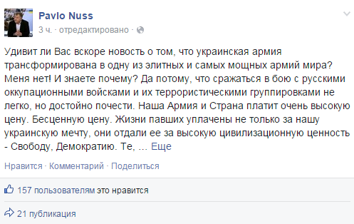 «Удивит ли Вас вскоре новость о том, что украинская армия трансформирована в одну из элитных и самых мощных армий мира? Меня нет! И знаете почему? Да потому, что сражаться в бою с русскими оккупационными войсками и их террористическими группировками не легко, но достойно почести. Наша Армия и Страна платит очень высокую цену. Бесценную цену. Жизни павших уплачены не только за нашу украинскую мечту, они отдали ее за высокую цивилизационную ценность - Свободу, Демократию. Те, кто говорит что армия не устаит - не предатели, а глупцы. Верховным Главнокомандующим, Президентом Порошенко уже было сказано, что Украина готова к защите своих земель, готова к обороне. Он уверен в своей армии и возможностях политико-дипломатического преимущества Украины и своей Администрации. Это значит, что Украина получила некий гарантийный пакет от Вашингтона, который очень обеспокаивает Кремль и, допускаю, блокирует реализацию сценария раздела Украины, да и вообще, реализацию сценариев Суркова-Путина.