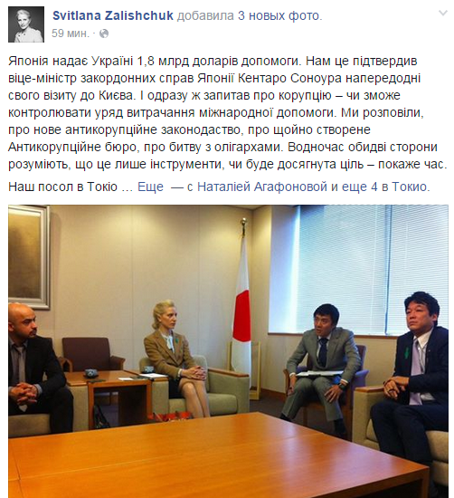 Это подтвердил вице-министр иностранных дел Японии Кентаро Соноура накануне визита в Киев, сообщила на своей странице в Facebook депутат от "Блока Петра Порошенко" Светлана Залищук.