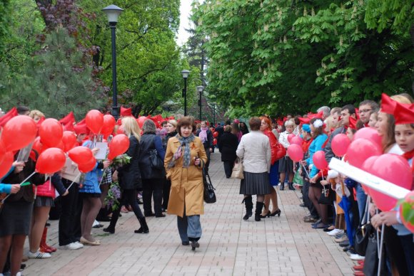 В руках у детворы были красные шарики портреты героев войны 1941-1945 гг. Причем некоторые принесли портреты своих дедушек и прадедушек. "Галстуки и пилотки взяли из школьных музеев. Это своего рода раритеты. Но детворе понравилось - для них это необычно", - рассказала Наталья Сергеевна, учитель ОШ города Донецка.