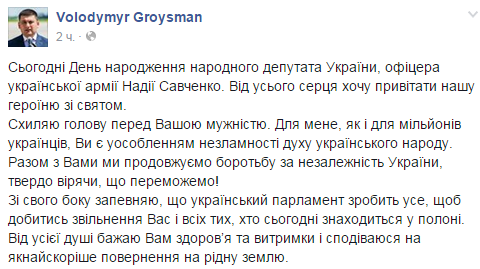 «…заверяю, что украинский парламент сделает все, чтобы добиться освобождения вас (Надежды Савченко) и всех тех, кто сегодня находится в плену", - написал Гройсман на своей странице в социальной сети Фейсбук в понедельник, поздравляя летчицу с днем рождения.