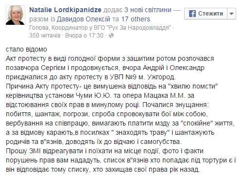 "Акт протеста в виде голодной формы с зашитым ртом начался позавчера Сергеем и продолжается, вчера Андрей и Александр присоединились к акту протеста в УВП №9 г. Ужгород.