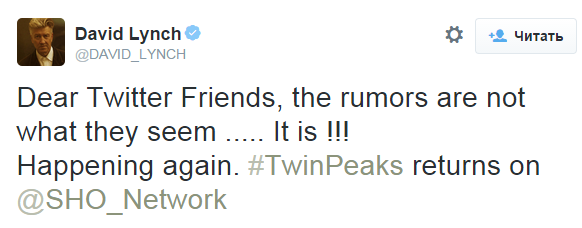 Режиссер Дэвид Линч намерен работать над продолжением известного сериала. О чем он и сообщил в своем Twitter.