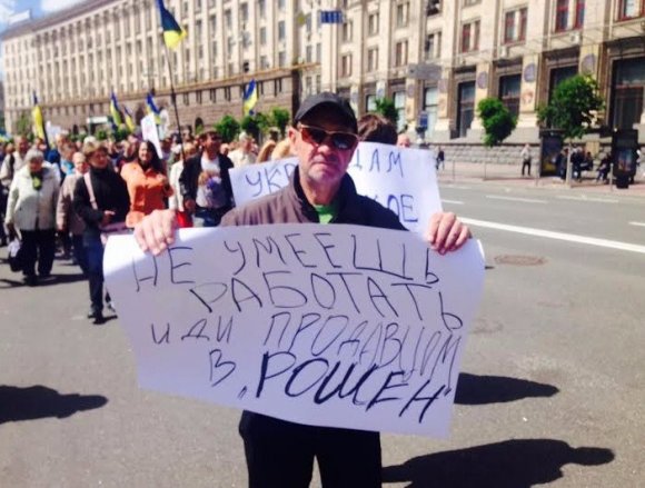 В это же время у митингующих имеются и плакаты с разнообразным содержанием: "Яценюк- нищета для Украины", "Украинцам - украинское правительство", "Не умеешь работать - иди продавцом в "Рошен" (этот слоган, скорее всего, в адрес президента Порошенко, - прим.)