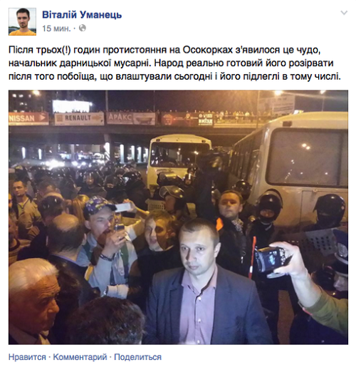 В эпицентр событий оказался и начальник Дарницкого ГУМВД, которого, по сообщениям одного из лидеров движения «Автомайдана» Виталия Уманца, толпа едва не разорвала.