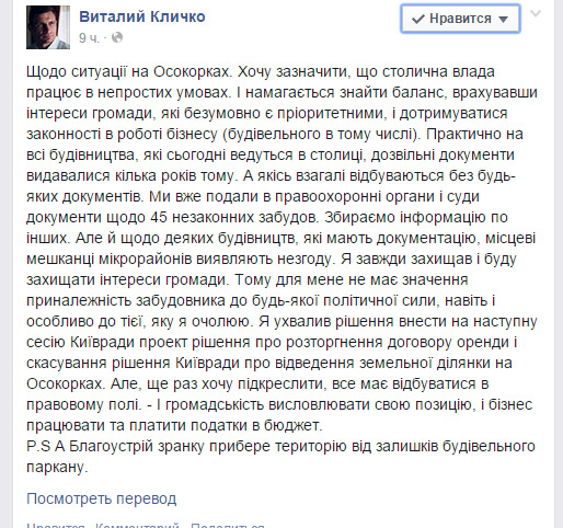 «Я принял решение внести на следующую сессию Киевсовета проект решения о расторжении договора аренды и отмене решения Киевсовета об отводе земельного участка на Осокорках. Но еще раз хочу подчеркнуть, что все должно происходить в правовом поле - и общественность - выражать свою позицию, и бизнес - работать и платить налоги в бюджет», - написал он.