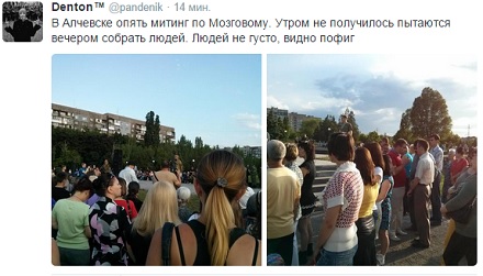 «В Алчевске опять митинг по Мозговому. Утром не получилось пытаются вечером собрать людей. Людей не густо, видно пофиг.»