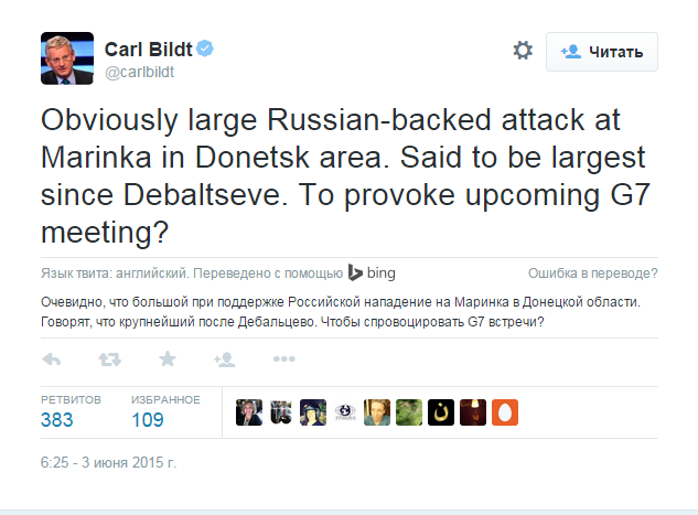 Наступление боевиков в Марьинке может быть провокацией в предверии саммита большой семерки. Об этом в своем Twitter написал экс-министр иностранных дел Швеции Карл Бильдт.