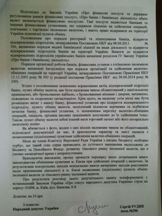 Народный депутат Украины (внефракционный), член Комитета по вопросам бюджета Сергей Рудык направил депутатский запрос, в частности, главе МВД Арсену Авакову и генпрокурору Виктору Шокину, с требованием прекратить в Киеве деятельность незаконных пунктов обмена иностранной валюты.