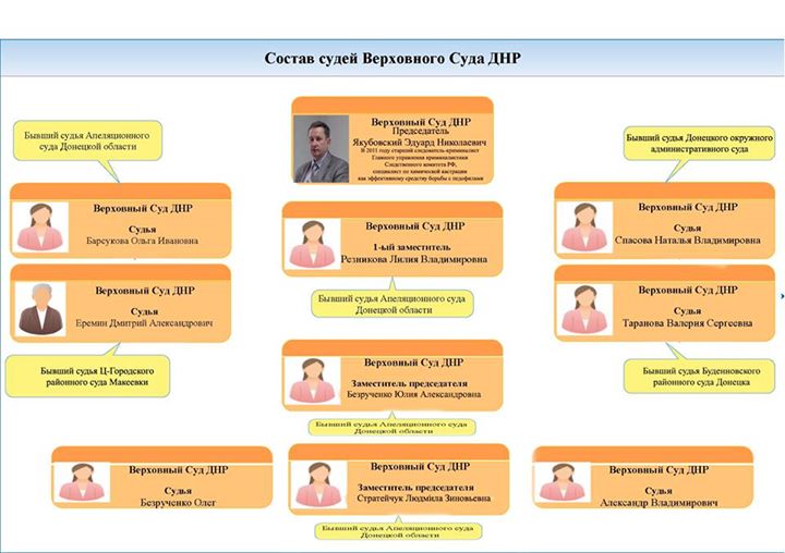 «В ДНР правосудие "вершат" бывший старший следователь-криминалист Главного управления криминалистики Следственного комитета РФ и бывшие судьи судебной системы Донецкой области, присягнувшие на службу терорристам. Именно они "решают" кого "казнить", а кого помиловать. Мы их уже знаем поименно, в отношении них переданы материалы в прокуратуру Донецкой области по факту участия в НВФ "ДНР"», - на своей странице в Facebook cообщил начальник ГУ МВД в Донецкой области Вячеслав Аброськин.