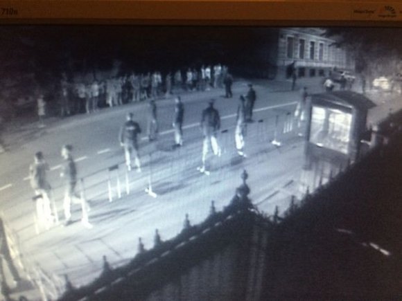 Сразу после этого к дипломатическому представительству подъехало около 10 автобусов с бойцами ОМОН. После небольшой паузы и переговоров лидеров этой группы молодежи с полицейскими, неожиданно около 20 человек выбежали со стороны полицейских и не встретив отпора со стороны правоохранителей начали бросать яйца в сторону посольства.