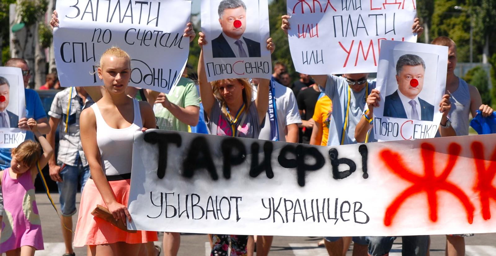 Участники акции резко осудили политику президента Украины Петра Порошенко и призвали к его отставке. Активисты держали плакаты: "Президента в отставку", "Тарифы убивают украинцев", "Заплати и спи голодным". Ряд активистов держали фото с изображением президента и надписью "Поросенко".