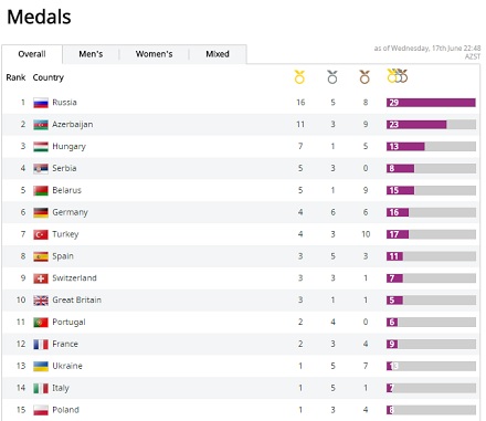 Россия продолжает возглавлять медальный зачет с 29-ю медалями - 16 золотых, 5 серебряных и 8 бронзовых. Следом идет команда Азербайджана – в активе страны-хозяйки игр 23 медали – из них 11 высшей пробы. Тройку замыкает сборная Венгрии с 13-ю медалями, из которых 7 – «золото».