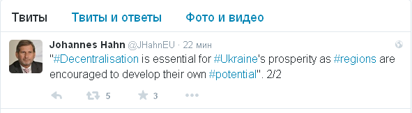 Комиссар Европейского Союза по вопросам расширения и политики добрососедства Йоханнес Хан заявил, что децентрализация имеет важное значение для процветания Украины. Об этом комиссар ЕС сообщил в своем микроблоге в Twitter.