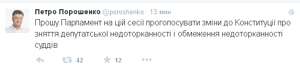 "Прошу Парламент на этой сессии проголосовать изменения в Конституцию о снятии депутатской неприкосновенности и ограничении неприкосновенности судей", - написал президент.