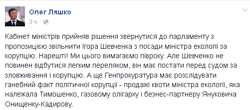 "Наконец-то! Мы этого требуем полгода. Но Шевченко не должен отделаться легким испугом, он должен предстать перед судом за злоупотребления и коррупцию. А еще Генпрокуратура должна расследовать позорный факт политической коррупции - продажи квоты министра экологии, которая принадлежала Тимошенко", - написал Ляшко.