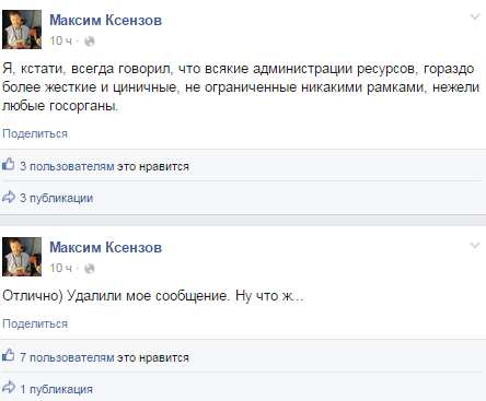 "Отлично) Удалили мое сообщение. Ну что ж... Я, кстати, всегда говорил, что всякие администрации ресурсов гораздо более жесткие и циничные, не ограниченные никакими рамками, нежели любые госорганы", - написал он на своей странице в соцсети.