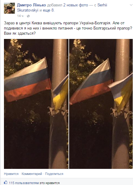 "Сейчас в центре Киева вывешивают флаги Украины-Болгария. Но вот посмотрел я на них и возник вопрос - это точно Болгарский флаг? Вам как кажется?", - пишет Линько.