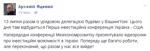 Он отметил, что тринадцатого июля вместе с делегацией Кабинета министров Украины он будет в Вашингтоне. Именно на этот день в столице Соединенных Штатов Америки запланирована Первая инвестиционная конференция между двумя странами.