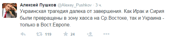 "Украинская трагедия далека от завершения. Как Ирак и Сирия были превращены в зону хаоса на Среднем Востоке, так и Украина - только в Восточной Европе", - заявил Пушков.