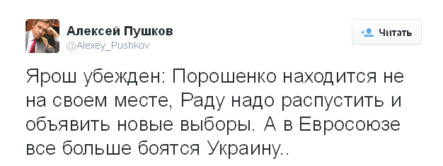«Ярош убежден: Порошенко находится не на своем месте, Раду надо распустить и объявить новые выборы. А в Евросоюзе все больше боятся Украину», — говорится в сообщении.