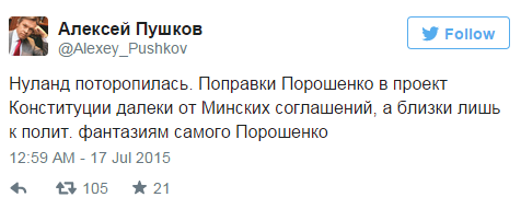 «Нуланд поторопилась. Поправки Порошенко в проект Конституции далеки от Минских соглашений, а близки лишь к политическим фантазиям самого Порошенко», - заявил Пушков на своей странице в микроблоге.