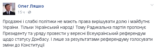 "Продажные и слабые политики не имеют права решать судьбу и будущее Украины. Только украинский народ! Поэтому Радикальная партия предлагает президенту и правительству провести в сентябре всеукраинский референдум о статусе Донбасса. И только по результатам референдума голосовать за изменения в конституцию", - заявил Олег Ляшко.