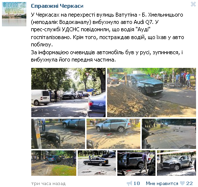 "В Черкассах на перекрестке улиц Ватутина - Б. Хмельницкого взорвалось авто Audi Q7. Водителя "Ауди" госпитализировано. Кроме того, пострадал водитель, ехавший в авто поблизости.