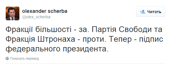 По его словам, за ратификацию проголосовали фракции большинства. Против выступили Партия Свободы и Фракция Штронаха. "Теперь — подпись федерального президента", — добавил в следующем посте дипломат.
