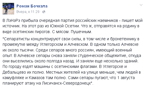 "В ЛНР прибыла очередная партия российских наемников - пишет мой источник. На этот раз из Южной Осетии. Что же, отправятся на родину в виде осетинских пирогов. С мясом. Пушечным", - написал журналист.