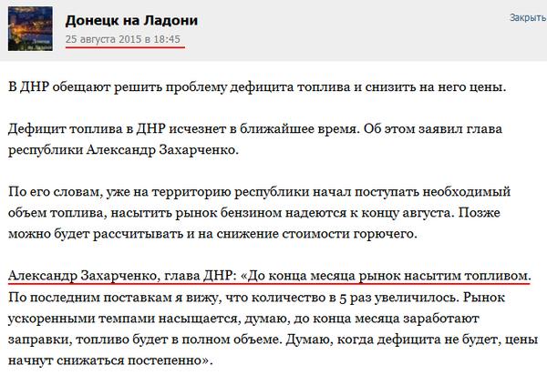 25 августа главарь ДНР снова обещает решить проблему дефицита топлива и снизить цену на него. Теперь он снова заявляет, что к концу месяца вопрос решится. Более того, он «видит, что количество поставок в 5 раз увеличилось».