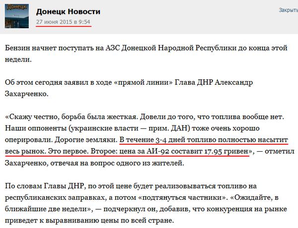 Тем временем в социальных сетях жители Донецка уже с любопытством фиксируют отсутствие динамики в «Бесконечном сериале "Захарченко насыщает рынок бензином"». Дончане пишут, что в лучших традициях мыльных опер главарь боевиков ДНР Александр Захарченко ежемесячно обещает мирному населению «насытить рынок бензином» и даже снизить цены до 17,95 гривен. Но уже прошло лето, а изменений нет.
