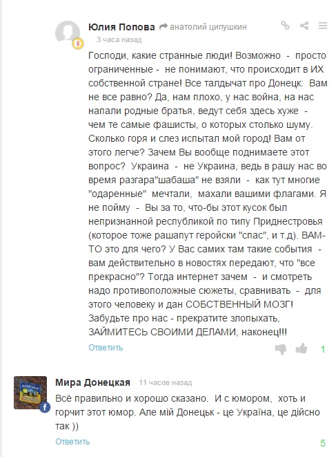 Господи, какие странные люди! Возможно - просто ограниченные - не понимают, что происходит в ИХ собственной стране! Все талдычат про Донецк: Вам не все равно? Да, нам плохо, у нас война, на нас напали родные братья, ведут себя здесь хуже - чем те самые фашисты, о которых столько шуму. Сколько горя и слез испытал мой город! Вам от этого легче? Зачем Вы вообще поднимаете этот вопрос? Украина - не Украина, ведь в рашу нас во время разгара"шабаша" не взяли - как тут многие "одаренные" мечтали, махали вашими флагами. Я не пойму - Вы за то, что-бы этот кусок был непризнанной республикой по типу Приднестровья (которое тоже рашапут геройски "спас", и т.д). ВАМ-ТО это для чего? У Вас самих там такие события - вам действительно в новостях передают, что "все прекрасно"? Тогда интернет зачем - и смотреть надо противоположные сюжеты, сравнивать - для этого человеку и дан СОБСТВЕННЫЙ МОЗГ! Забудьте про нас - прекратите злопыхать, ЗАЙМИТЕСЬ СВОИМИ ДЕЛАМИ, наконец!!!