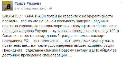 Как написала в Facebook активистка крымской блокады Гайдэ Ризаева, задержанный Эдуард Федоров курировал доставку в оккупированный Крым 100 килограмм сосисок. Более того, у чиновника обнаружили и паспорт гражданина Российской Федерации.