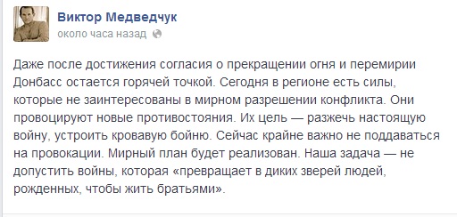 "Даже после достижения согласия о прекращении огня и перемирии Донбасс остается горячей точкой. Сегодня в регионе есть силы, которые не заинтересованы в мирном разрешении конфликта. Они провоцируют новые противостояния", - написал Медведчук на своей странице в Facebook.