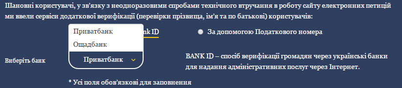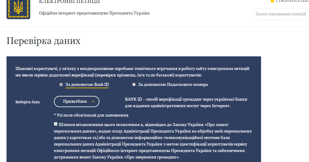 Итак, отныне для того, чтобы отдать свой голос, либо же подать петицию, пользователь сайта обязан пройти своеобразную верификацию. Человеку предложат на выбор или ввести идентификационный номер, либо же вписать в специальный раздел номер банковской карты.