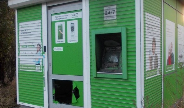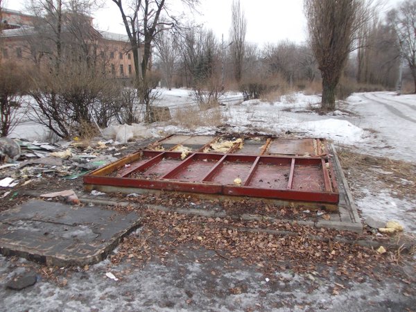 На фото видны заросшие травой остановки, поваленные железные конструкции, сожженные банкоматы.
