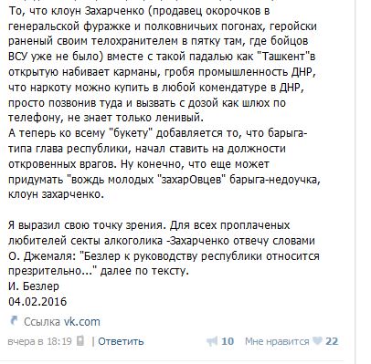 “Клоун Захарченко…продавец окорочков в генеральской фуражке и полковничьих погонах … барыга- типа глава республики”, - раскритиковал Захарченко Безлер, отмечая, что “ДНР” превратилось в место зарабатывания денег ее руководителя и его прихлебателей.