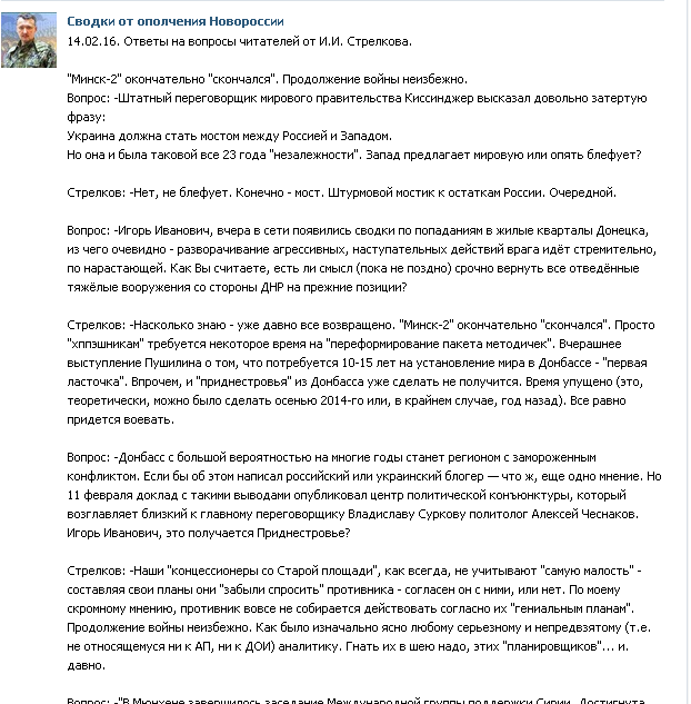 ""Минск-2" окончательно "скончался". Просто "хппэшникам" требуется некоторое время на переформирование пакета методичек… Все равно придется воевать", - пояснил Стрелков.