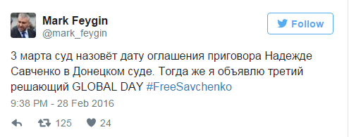 "3 марта суд назовёт дату оглашения приговора Надежде Савченко в Донецком суде", - констатировал он.
