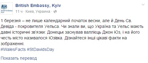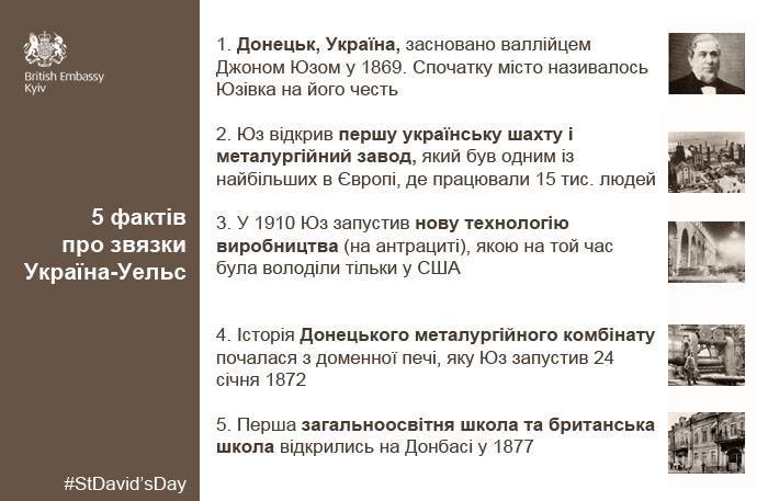 Как известно, 1 марта это не только первый день весны. Это еще и День Святого Давида – покровителя Уэльса. Не многие знают, что Украина и Уэльс имеют давние крепкие исторические связи: Джон Юз основал Донецк, некоторое время город назывался в его честь – Юзовка.