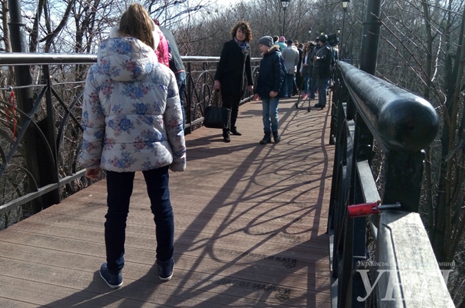 Открытие отреставрированного моста в честь 8 марта вызвало большой ажиотаж среди киевлян. Жители столицы не просто приходили на праздник влюбленными парами, но и целыми семьями с маленькими детьми.