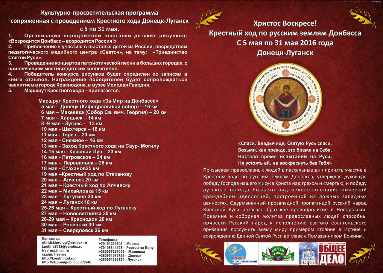 "Крестных ход", по данным нардепа и руководителя группы "Информационное сопротивление" Дмитрия Тымчука, анонсирован с 5 и по 31 мая. Он стартует с Донецка и пройдет по оккупированным городам Луганской и Донецкой областей с заходом на наиболее горячие точки боев оккупантов с украинскими бойцами.
