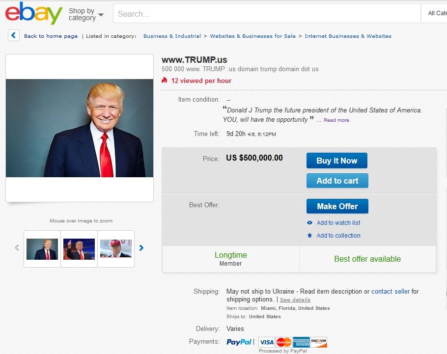 На известном ресурсе Ebay, появилось объявление, где предлагается купить домен "будущего президента США Дональда Трампа, который является желанным многими людьми в мире".