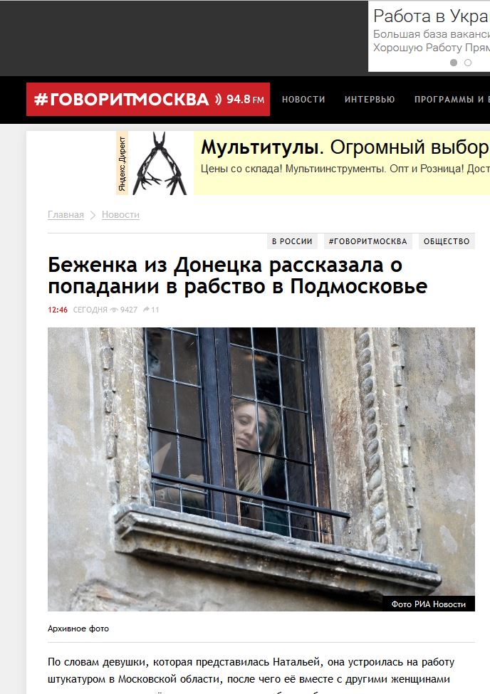 У Натальи (так девушка представилась изданию) после очередного обстрела оккупантов в Донецке не осталось дома. В поисках лучшей доли она приехала на заработки в Москву, тем более что "русский мир" приглашал к себе жителей оккупированных территорий "ЛНР" и "ДНР". Девушке удалось устроиться штукатуром в Московской области, среди ее коллег было много женщин. Однако на деле красивые обещания о заработках для беженки из Донецка обернулись настоящим кошмаром.